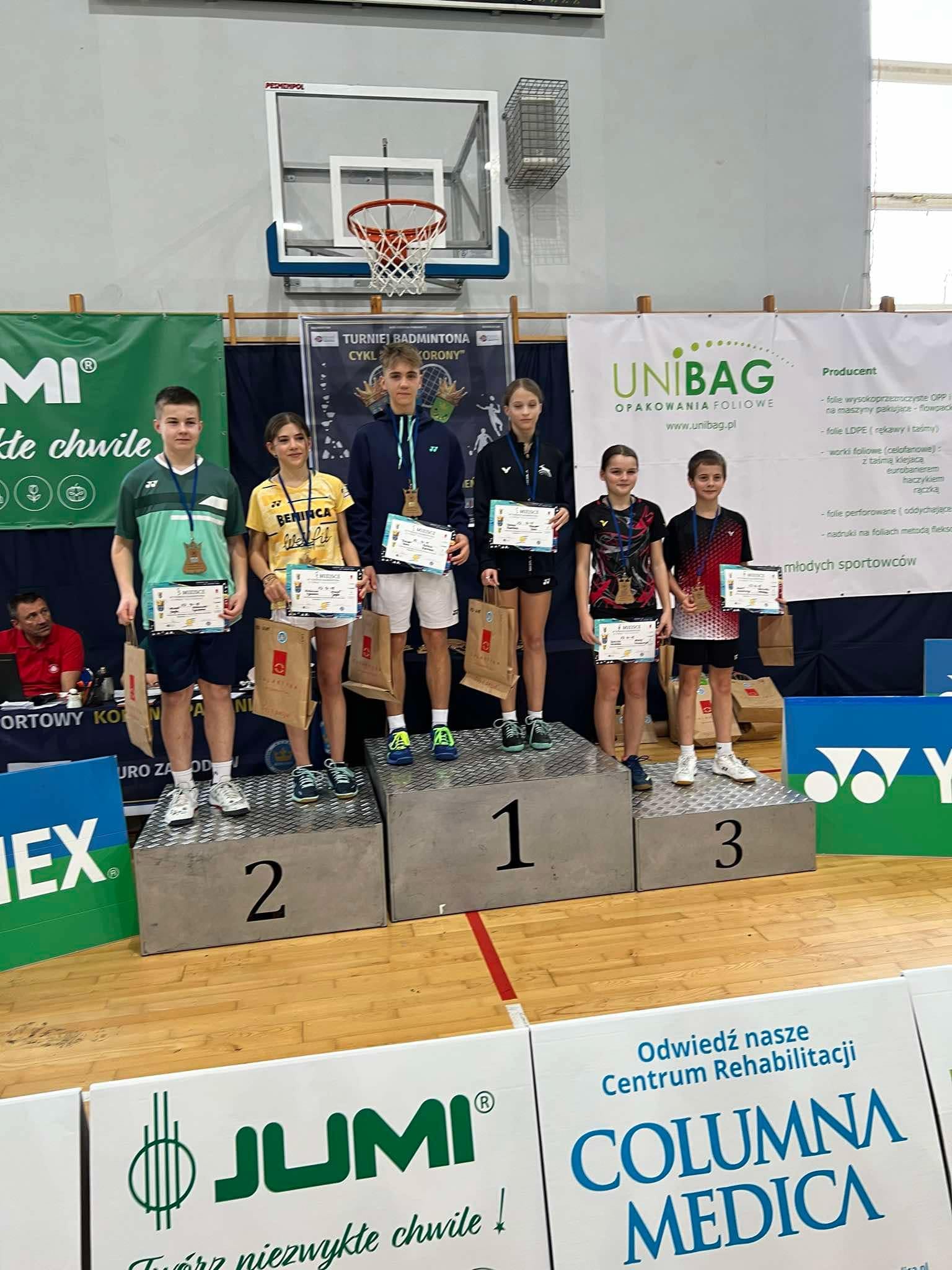 Wysokie 3 miejsce w grze podwójnej zajęli Olgierd Byczek oraz Wojciech Kamiński. W półfinale nie sprostali rozstawionym z nr 1 zawodnikom LKS Technik Głubczyce – Ignacy Walaszek, Hubert Wiciak – 22:24, 15:21. W grze pojedynczej po wygraniu grupy Olgierd awansował do fazy pucharowej i tam zmierzył się ze swoim klubowym kolegą Kacprem Koszem. Kacper w tym pojedynku wygrał 21:12, 21:4 i awansował do kolejnej rundy. Do ćwierćfinału awansował Wojciech Kamiński, który w walce o półfinał zmierzył się z rozstawionym z nr 2 Ignacym Walaszkiem. Po dobrej grze i wyrównanym pojedynku nasz zawodnik musiał uznać wyższość badmintonisty z Głubczyc przegrywając 14:21, 19:21. Wojtek i Olgierd rywalizowali również w grze mieszanej, ale po wyrównanych pojedynkach zakończyli zawody na fazie grupowej.